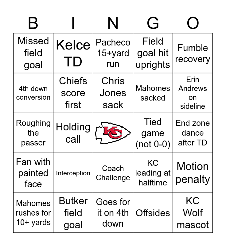 This bingo card has a free space and 24 words: Interception, Butker field goal, Chris Jones sack, Mahomes rushes for 10+ yards, Fumble recovery, Missed field goal, 4th down conversion, Kelce TD, Tied game (not 0-0), Coach Challenge, Mahomes sacked, Roughing the passer, KC leading at halftime, Motion penalty, Chiefs score first, Offsides, End zone dance after TD, Pacheco 15+yard run, Erin Andrews on sideline, Holding call, KC Wolf mascot, Fan with painted face, Field goal hit uprights and Goes for it on 4th down.