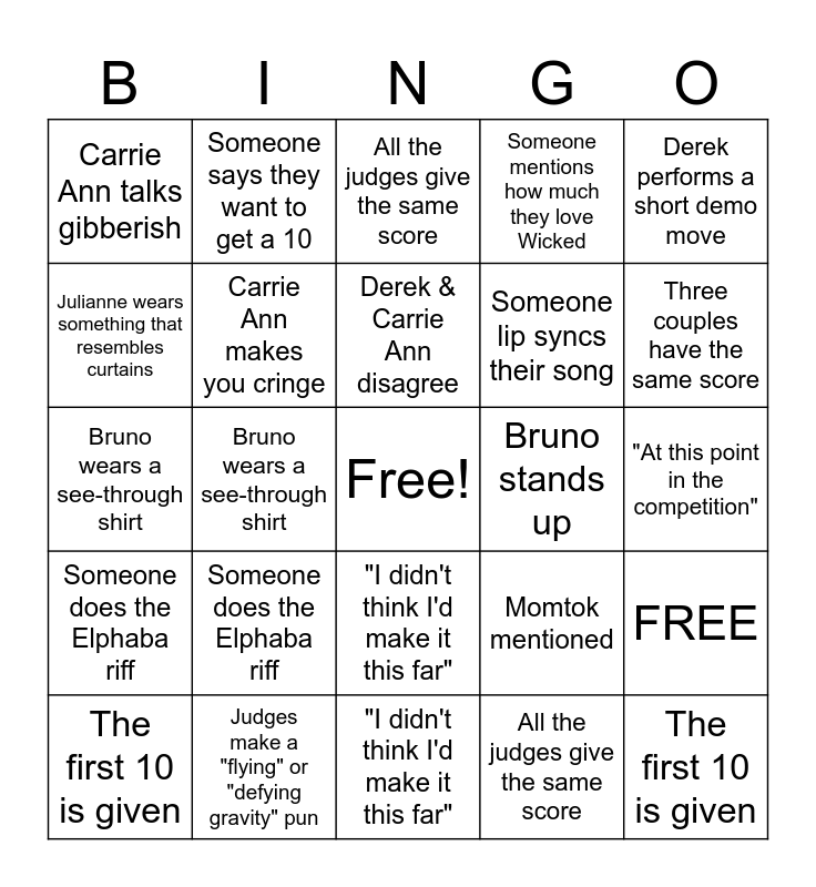 ⚠ This card has duplicate items: The first 10 is given (2), Carrie Ann gets booed (2), "I didn't think I'd make it this far" (2), Someone does the Elphaba riff (2), Alan has a crazy costume (2), Someone says they want to get a 10 (2), Someone is painted green (2), Julianne wears something that resembles curtains (2), Judges make a "flying" or "defying gravity" pun (2), Carrie Ann makes you cringe (2), Someone mentions how much they love Wicked (2), Momtok mentioned (2), "At this point in the competition" (2), Bruno says "My Darling" (2), Derek & Carrie Ann disagree (2), Bruno stands up (2), Derek performs a short demo move (2), Bruno wears a see-through shirt (2), All the judges give the same score (2), Carrie Ann talks gibberish (2), Someone lip syncs their song (2), some "holds space" (2)