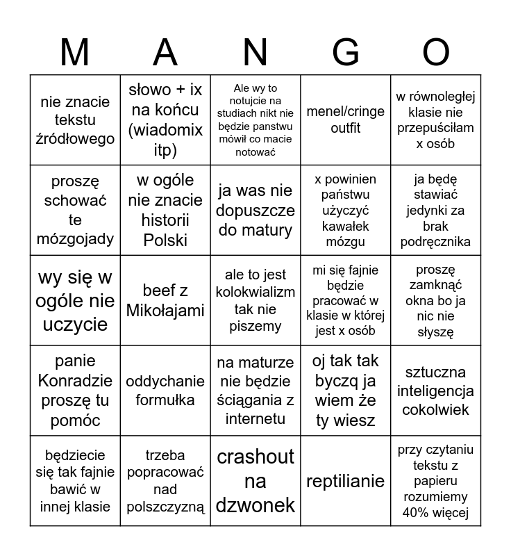 This bingo card has 25 words: oddychanie formułka, crashout na dzwonek, ja was nie dopuszcze do matury, będziecie się tak fajnie bawić w innej klasie, w równoległej klasie nie przepuściłam x osób, nie znacie tekstu źródłowego, proszę schować te mózgojady, słowo + ix na końcu (wiadomix itp), mi się fajnie będzie pracować w klasie w której jest x osób, na maturze nie będzie ściągania z internetu, x powinien państwu użyczyć kawałek mózgu, wy się w ogóle nie uczycie, oj tak tak byczq ja wiem że ty wiesz, sztuczna inteligencja cokolwiek, w ogóle nie znacie historii Polski, przy czytaniu tekstu z papieru rozumiemy 40% więcej, proszę zamknąć okna bo ja nic nie słyszę, Ale wy to notujcie na studiach nikt nie będzie panstwu mówił co macie notować, ja będę stawiać jedynki za brak podręcznika, beef z Mikołajami, ale to jest kolokwializm tak nie piszemy, trzeba popracować nad polszczyzną, panie Konradzie proszę tu pomóc, menel/cringe outfit and reptilianie.