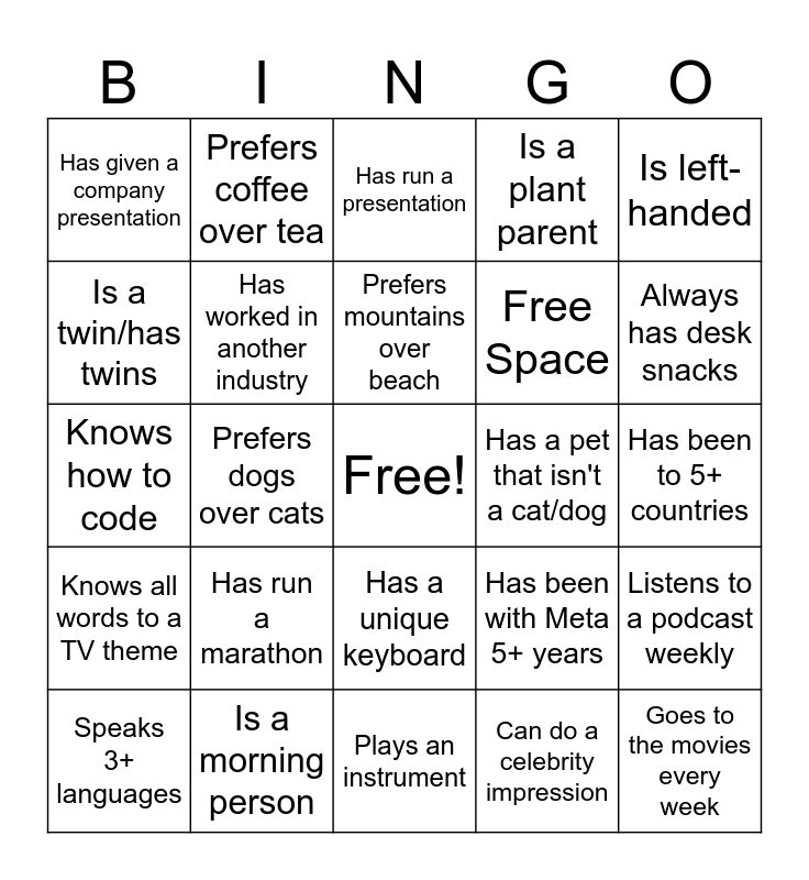 This bingo card has a free space and 25 words: Has run a marathon, Plays an instrument, Prefers mountains over beach, Speaks 3+ languages, Is left-handed, Has given a company presentation, Is a twin/has twins, Prefers coffee over tea, Has a pet that isn't a cat/dog, Has a unique keyboard, Free Space, Knows how to code, Has been with Meta 5+ years, Listens to a podcast weekly, Has worked in another industry, Plays video games regularly, Has been to 5+ countries, Has run a presentation, Always has desk snacks, Prefers dogs over cats, Goes to the movies every week, Is a morning person, Knows all words to a TV theme, Is a plant parent and Can do a celebrity impression.