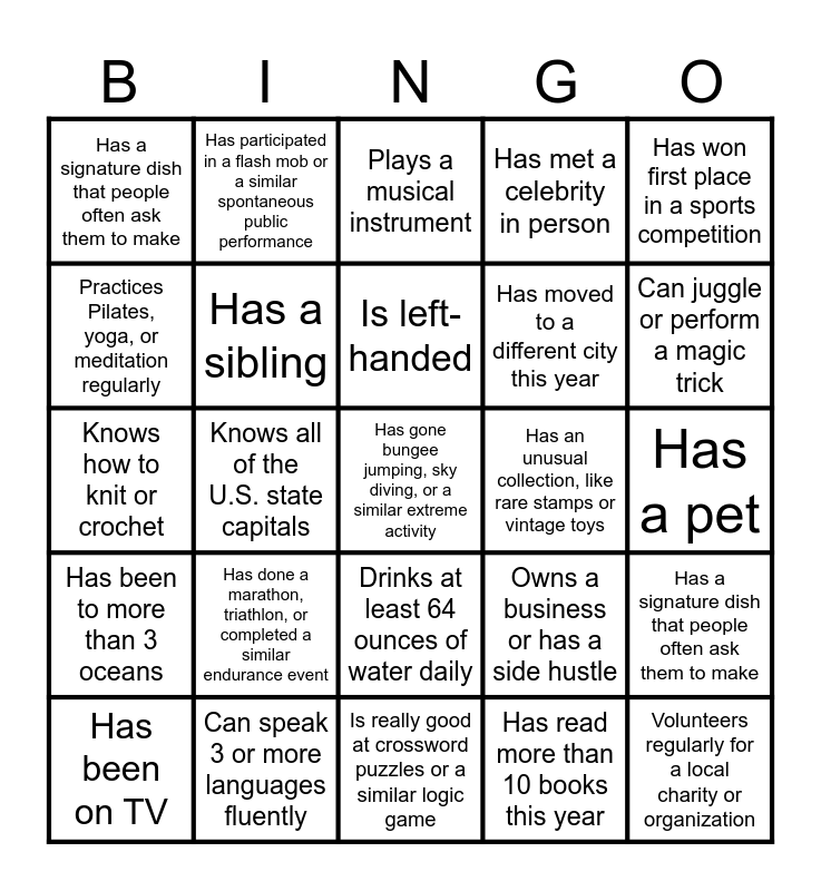 This bingo card has a free space and 24 words: Has done a marathon, triathlon, or completed a similar endurance event, Can speak 3 or more languages fluently, Is left-handed, Has been on TV, Has won first place in a sports competition, Has a signature dish that people often ask them to make, Practices Pilates, yoga, or meditation regularly, Has participated in a flash mob or a similar spontaneous public performance, Has an unusual collection, like rare stamps or vintage toys, Drinks at least 64 ounces of water daily, Has moved to a different city this year, Knows how to knit or crochet, Owns a business or has a side hustle, Has a signature dish that people often ask them to make, Has a sibling, Has read more than 10 books this year, Has a pet, Plays a musical instrument, Can juggle or perform a magic trick, Knows all of the U.S. state capitals, Volunteers regularly for a local charity or organization, Has been to more than 3 oceans, Has met a celebrity in person and Is really good at crossword puzzles or a similar logic game.