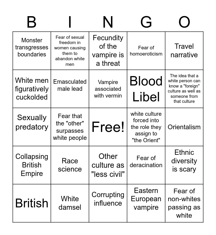This bingo card has a free space and 24 words: Race science, White damsel, Vampire associated with vermin, British, Travel narrative, Monster transgresses boundaries, White men figuratively cuckolded, Fear of sexual freedom in women causing them to abandon white men, white culture forced into the role they assign to "the Orient", Other culture as "less civil", Blood Libel, Sexually predatory, Fear of deracination, Ethnic diversity is scary, Emasculated male lead, Eastern European vampire, Orientalism, Fecundity of the vampire is a threat, The idea that a white person can know a "foreign" culture as well as someone from that culture, Fear that the "other" surpasses white people, Fear of non-whites passing as white, Collapsing British Empire, Fear of homoeroticism and Corrupting influence.