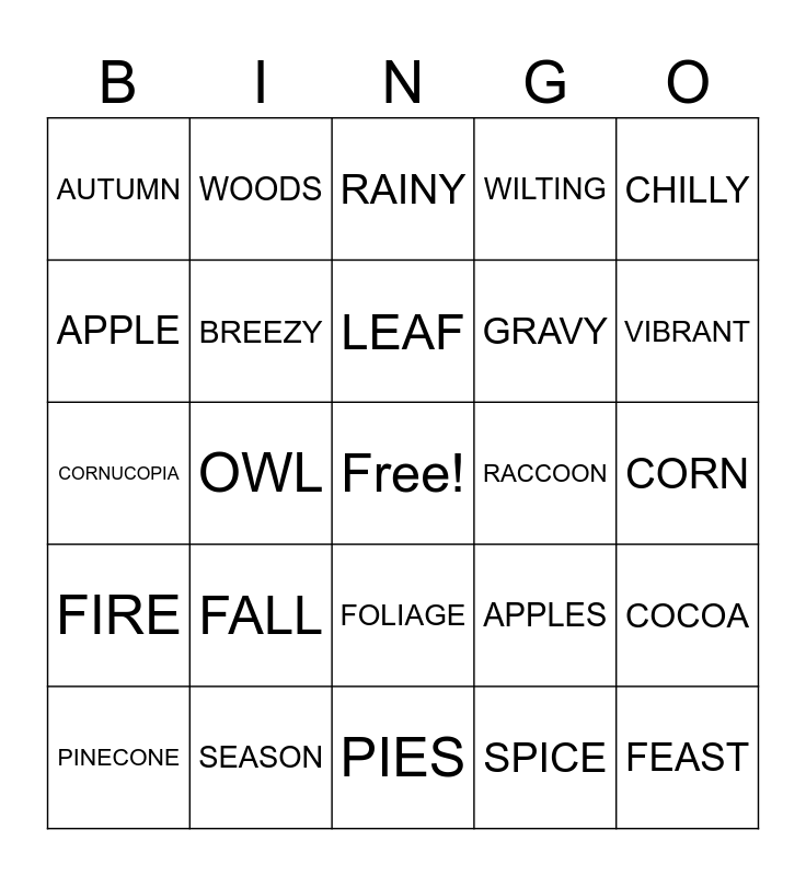 This bingo card has a free space and 74 words: CRANBERRY, BONFIRE, RAINY, GOLD, SCARF, FIREPLACE, FALLING, JACKET, PINECONE, CANDY APPLES, BRISK, EARTHY, LEAF, APPLE, ACORN, OWL, GREEN, VIBRANT, PUMPKIN, CORNUCOPIA, BREEZY, WOODS, WILTING, YELLOW, FEAST, CROW, FESTIVAL, NATURE, FAMILY, FLANNEL, CHILLY, HARVEST, BROWN, FOGGY, OCTOBER, SPICE, THANKFUL, CANDY CORN, BOOTS, COZY, PIES, SEASON, SWEATER, TREE, SPOOKY, AUTUMN, SCARECROW, FALL, COAT, ORANGE, MAPLE LEAF, NOVEMBER, CORN, WINDY, FOX, COLD, FOLIAGE, PARTY, GOBBLE, COCOA, GRAVY, TURKEY, FIRE, TRUCK, RACCOON, PILGRIM, RAKE, WHEELBARROW, APPLES, GATHER, HAT, HEDGEHOG, FUN and BEAR.