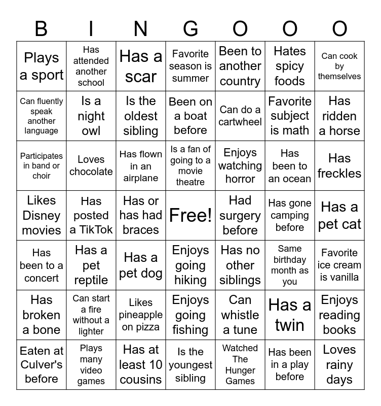 This bingo card has a free space and 48 words: Can whistle a tune, Favorite subject is math, Is the youngest sibling, Has posted a TikTok, Has flown in an airplane, Has a pet cat, Has attended another school, Plays many video games, Hates spicy foods, Enjoys going hiking, Can cook by themselves, Favorite season is summer, Has been to an ocean, Enjoys watching horror, Has broken a bone, Has gone camping before, Can fluently speak another language, Has ridden a horse, Has a twin, Been to another country, Can do a cartwheel, Has or has had braces, Plays a sport, Is a night owl, Enjoys reading books, Is the oldest sibling, Has freckles, Eaten at Culver's before, Is a fan of going to a movie theatre, Loves chocolate, Has been in a play before, Had surgery before, Favorite ice cream is vanilla, Can start a fire without a lighter, Likes Disney movies, Has no other siblings, Same birthday month as you, Participates in band or choir, Has a pet dog, Likes pineapple on pizza, Has been to a concert, Loves rainy days, Has a scar, Has at least 10 cousins, Been on a boat before, Enjoys going fishing, Has a pet reptile and Watched The Hunger Games.