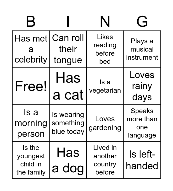 This bingo card has 16 words: Has a dog, Speaks more than one language, Likes reading before bed, Has met a celebrity, Is a morning person, Can roll their tongue, Loves gardening, Lived in another country before, Free!, Has a cat, Is the youngest child in the family, Plays a musical instrument, Is wearing something blue today, Loves rainy days, Is a vegetarian and Is left-handed.