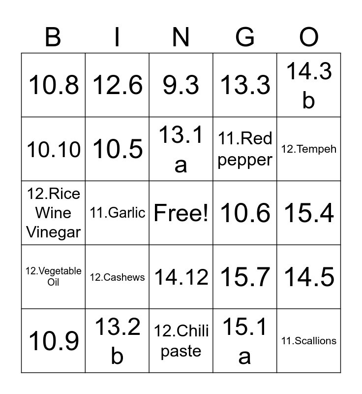 This bingo card has a free space and 85 words: 9.1, 9.3, 9.3, 9.4, 9.5, 9.6, 9.7, 9.8, 10.1, 10.2, 10.3, 10.4, 10.5, 10.6, 10.7, 10.8, 10.9, 10.10, 11.Red Wine Vinegar, 11.Dry White Wne, 11.Olive Oil, 11.Red pepper, 11.Scallions, 11.Jalapenos, 11.Garlic, 11.Basil, 11.Fennel Tops, 11.Tarragon, 11.Thyme, 11.Soft-Shelled Crabs, 12.Cashews, 12.Garlic Cloves, 12.Soy Sauce, 12.Rice Wine Vinegar, 12.Brown Sugar, 12.Sesame Oil, 12.Chili paste, 12.Udon noodles, 12.Vegetable Oil, 12.Tempeh, 12.Onions, 12.Red Pepper, 12.Zucchini, 12.Green beans, 12.1, 12.2, 12.3, 12.4, 12.5 a, 12.5 b, 12.6, 13.1 a, 13.1 b, 13.1 c, 13.1 d, 13.2 a, 13.2 b, 13.3, 13.4 a, 13.4 b, 13.5, 14.1, 14.2 a, 14.2 b, 14.3 a, 14.3 b, 14.4, 14.5, 14.6, 14.7, 14.8, 14.9 a, 14.9 b, 14.10, 14.11, 14.12, 15.1 a, 15.1 b, 15.2, 15.3, 15.4, 15.5, 15.6, 15.7 and 15.8.