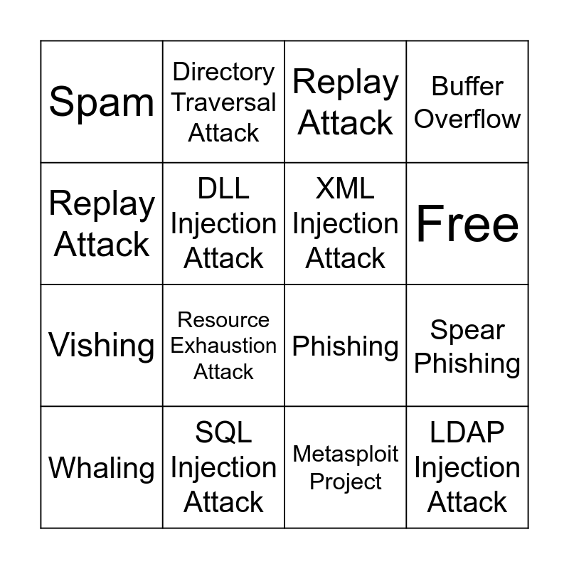 This bingo card has 16 words: SQL Injection Attack, Spear Phishing, Replay Attack, Spam, Vishing, Directory Traversal Attack, Phishing, Metasploit Project, Replay Attack, DLL Injection Attack, Whaling, Buffer Overflow, Resource Exhaustion Attack, Free, XML Injection Attack and LDAP Injection Attack.