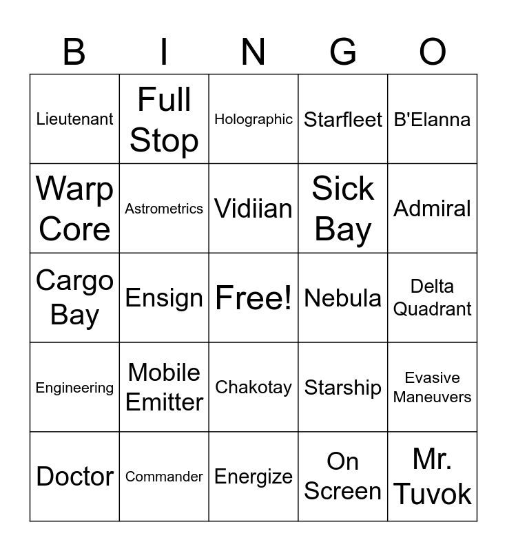 This bingo card has a free space and 54 words: Alpha Quadrant, Engineering, Full Impulse, Voyager, Chakotay, Harry, Starfleet, Janeway, Warp Core, Auxiliary Power, Lieutenant, Computer, Commander, Doctor, Jeffries Tube, Energize, Mr. Tuvok, Sick Bay, Mr. Paris, Delta Quadrant, Starship, Offline, Nebula, B'Elanna, Neelix, Full Stop, Federation, Seven, Nacelles, On Screen, Sentient, Red Alert, Quarters, Sensors, Holographic, Damage Report, Cargo Bay, Evasive Maneuvers, Life Support, Astrometrics, Borg, Drone, Holodeck, Hull Breach, Mobile Emitter, Seven, Naomi, Holodeck, Vidiian, Ensign, Admiral, Kathryn, Mr. Vulcan and Medical Emergency.