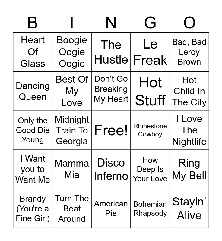 This bingo card has a free space and 50 words: My Sharona, Stayin’ Alive, Video Killed The Radio Star, American Pie, Mamma Mia, Kung Fu Fighting, Boogie Oogie Oogie, Shadow Dancing, Dancing Queen, I Will Survive, Best Of My Love, Le Freak, Ring My Bell, How Deep Is Your Love, Tonight’s The Night, Superstition, Don’t Go Breaking My Heart, Rhinestone Cowboy, Shake, Shake, Shake, Bad, Bad Leroy Brown, Midnight Train To Georgia, Bohemian Rhapsody, Heart Of Glass, Hot Stuff, Y.M.C.A., Let’s Get It On, Hot Child In The City, Play That Funky Music, The Hustle, Disco Inferno, We Are Family, Car Wash, Funky Town, Lady Marmalade, Turn The Beat Around, Jungle Boogie, Don’t Stop ‘till You Get Enough, Last Dance, Rock The Boat, I Love The Nightlife, Psycho Killer, Boys Don't Cry, Rock Lobster, September, Brandy (You're a Fine Girl), Only the Good Die Young, Jolene, Take me Home, Country Roads, I Want you to Want Me and Cecilia.