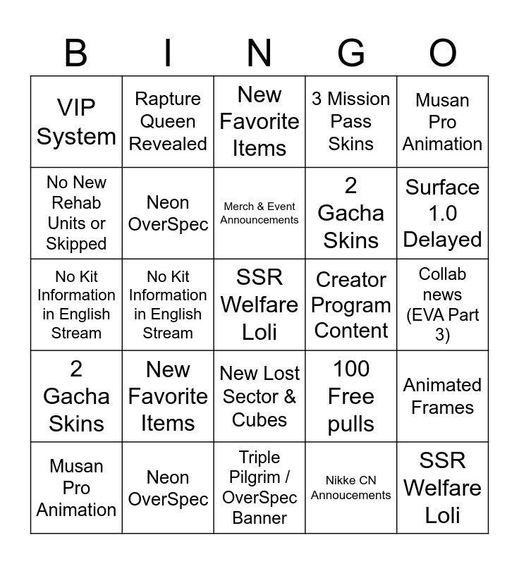 ⚠ This card has duplicate items: Modernia Alter (3), SSR Welfare Loli (2), Surface 1.0 Delayed (2), Triple Pilgrim / OverSpec Banner (2), New Favorite Items (2), New Lost Sector & Cubes (2), Rapture Queen Revealed (2), Red Hood Gacha Skin (2), No New Rehab Units or Skipped (2), Anis OverSpec (2), Neon OverSpec (2), 3 Mission Pass Skins (2), Animated Frames (2), 100 Free pulls (2), Collab news (EVA Part 3) (2), Countdown for countdown (2), Merch & Event Announcements (2), Creator Program Content (2), Apology for Solo Raid Bugs (2), Musan Pro Animation (2), No Kit Information in English Stream (2), Nikke CN Annoucements (2), VIP System (2), 2 Gacha Skins (2)