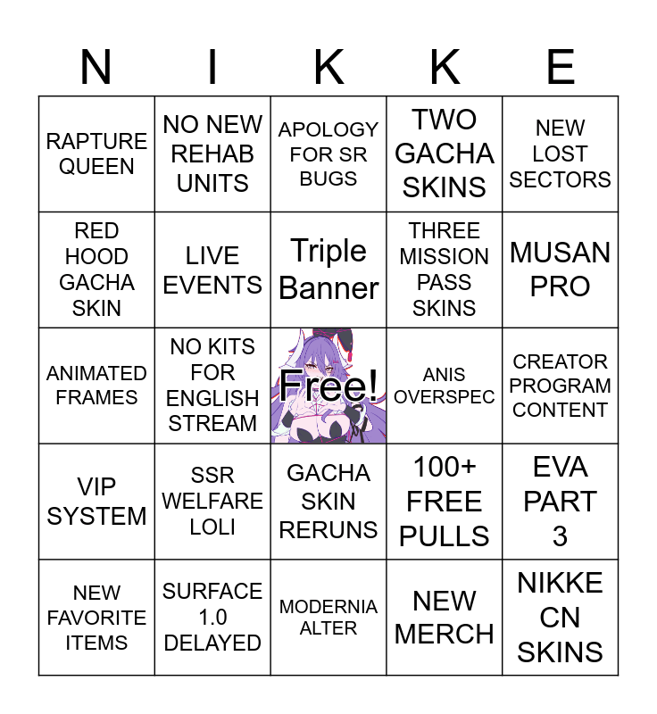 This bingo card has a free space and 24 words: SSR WELFARE LOLI, SURFACE 1.0 DELAYED, Triple Banner, NEW FAVORITE ITEMS, NEW LOST SECTORS, RAPTURE QUEEN, RED HOOD GACHA SKIN, NO NEW REHAB UNITS, ANIS OVERSPEC, GACHA SKIN RERUNS, THREE MISSION PASS SKINS, ANIMATED FRAMES, 100+ FREE PULLS, EVA PART 3, LIVE EVENTS, NEW MERCH, CREATOR PROGRAM CONTENT, APOLOGY FOR SR BUGS, MUSAN PRO, NO KITS FOR ENGLISH STREAM, NIKKE CN SKINS, VIP SYSTEM, TWO GACHA SKINS and MODERNIA ALTER.