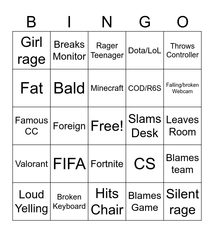 This bingo card has a free space and 24 words: FIFA, Broken Keyboard, Minecraft, Loud Yelling, Throws Controller, Girl rage, Fat, Breaks Monitor, Slams Desk, Fortnite, COD/R6S, Famous CC, CS, Blames team, Bald, Blames Game, Leaves Room, Rager Teenager, Falling/broken Webcam, Foreign, Silent rage, Valorant, Dota/LoL and Hits Chair.