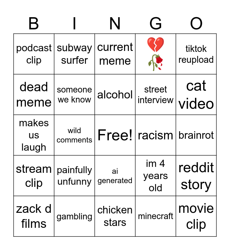 This bingo card has a free space and 24 words: painfully unfunny, gambling, alcohol, zack d films, tiktok reupload, podcast clip, dead meme, subway surfer, racism, ai generated, street interview, makes us laugh, im 4 years old, reddit story, someone we know, minecraft, brainrot, current meme, cat video, wild comments, movie clip, stream clip, 💔🥀 and chicken stars.