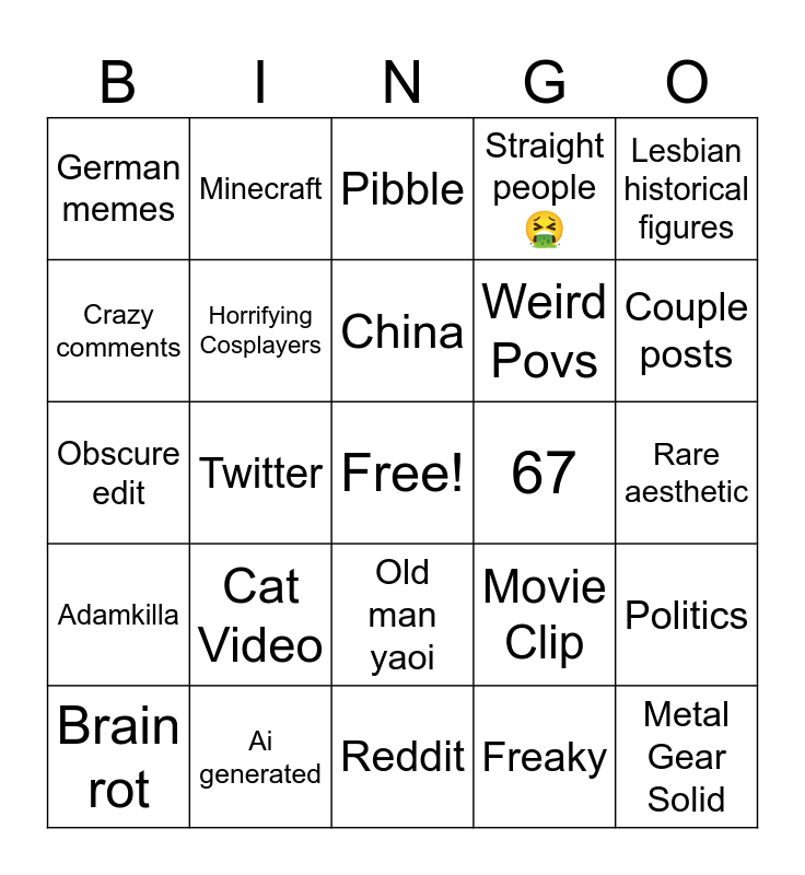 This bingo card has a free space and 24 words: Cat Video, Ai generated, China, Brain rot, Lesbian historical figures, German memes, Crazy comments, Minecraft, 67, Old man yaoi, Weird Povs, Obscure edit, Movie Clip, Politics, Horrifying Cosplayers, Freaky, Rare aesthetic, Pibble, Couple posts, Twitter, Metal Gear Solid, Adamkilla, Straight people 🤮 and Reddit.