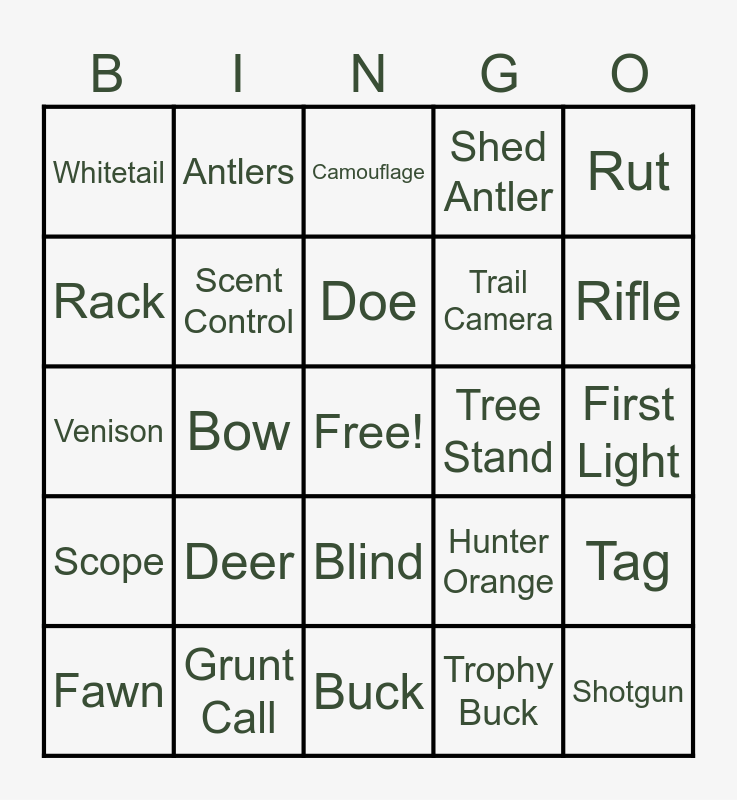 This bingo card has a free space and 25 words: Deer, Buck, Doe, Fawn, Rut, Whitetail, Rack, Antlers, Tree Stand, Blind, Trail Camera, Venison, Hunter Orange, Tag, Scent Control, Tracks, First Light, Camouflage, Rifle, Bow, Shotgun, Grunt Call, Scope, Shed Antler and Trophy Buck.