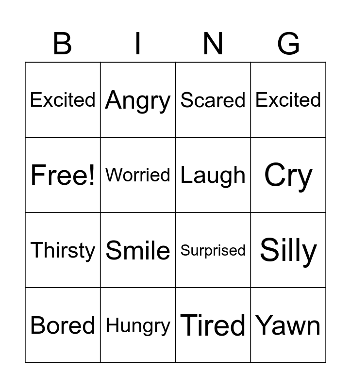 This bingo card has 16 words: Hungry, Silly, Scared, Excited, Thirsty, Angry, Surprised, Tired, Free!, Worried, Bored, Excited, Smile, Cry, Laugh and Yawn.