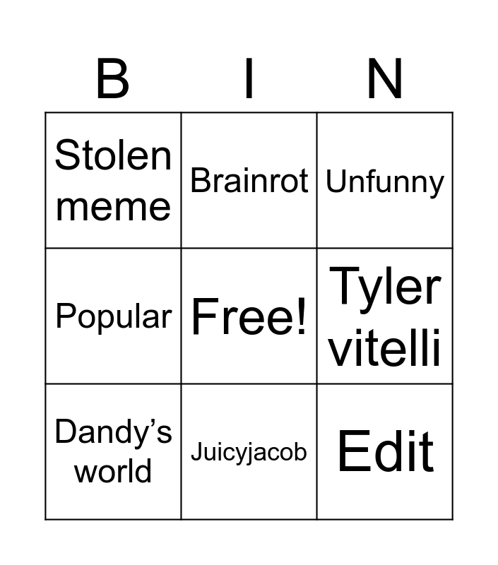 This bingo card has a free space and 8 words: Tyler vitelli, Unfunny, Brainrot, Dandy’s world, Stolen meme, Edit, Popular and Juicyjacob.