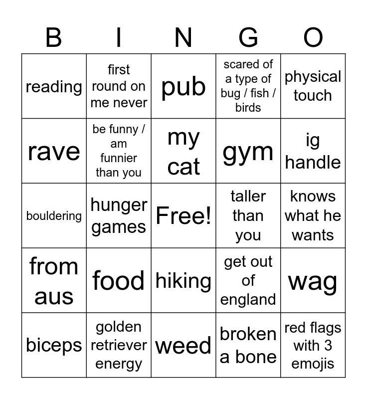 This bingo card has a free space and 24 words: food, golden retriever energy, my cat, biceps, physical touch, reading, rave, first round on me never, taller than you, hiking, gym, bouldering, get out of england, wag, be funny / am funnier than you, broken a bone, knows what he wants, pub, ig handle, hunger games, red flags with 3 emojis, from aus, scared of a type of bug / fish / birds and weed.