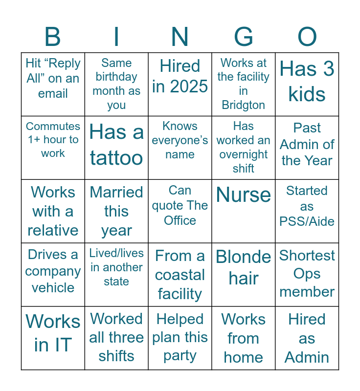 This bingo card has a free space and 79 words: From the facility with the least residents, Worked for the company the longest, Hired in 2025, Wears glasses, Traveled the furthest to attend, Went to a concert this year, Can play an instrument, Left-handed, First company dinner, Doesn’t drink coffee, Star of the TikTok account, Has changed facilities, Works at the facility in Bridgton, Hit “Reply All” on an email, Works at the memory-care facility, Commutes 1+ hour to work, Born in October, Lived/lives in another state, Works at two facilities, Started as PSS/Aide, Works at the all-ladies facility, Has 3 kids, Works with a relative, Knows everyone’s name, Has a tattoo, Swiftie (loves Taylor Swift), Loves country music, Loves rap music, Has grandkids, Always early, Past Admin of the Year, Can name all Brock Health facilities, Helped plan this party, From the facility with the most private-pay residents, Works in IT, Nurse, Works in HR, Works in Marketing, Started as CRMA, Hired as Admin, Coffee addict, Never takes a sick day, Has a cat, Has a dog, Attended every company event, Same birthday month as you, Company owner, “Manager” in title, “Director” in title, Tallest Ops member, Shortest Ops member, Married this year, Blonde hair, Black hair, Youngest person here, Longest-tenured RCD, Does MDS assessments, From our most recent facility opened, From our first facility opened, From a coastal facility, Has worked an overnight shift, Dressed as part of a group tonight, Always does karaoke, From the northernmost facility, From a facility in Downeast Maine, Wears a smartwatch, Travels to facilities for work, From a facility with 60 residents, From a facility with 57 residents, Drives a company vehicle, Worked all three shifts, Uses exclamation points in emails, Always taking photos during work events, Can fill in for Maintenance, Knows all the words to all the songs, Works from home, In the “Fart” TikTok video with 130k views, From one of the two facilities in Dover-Foxcroft and Admin at two facilities.