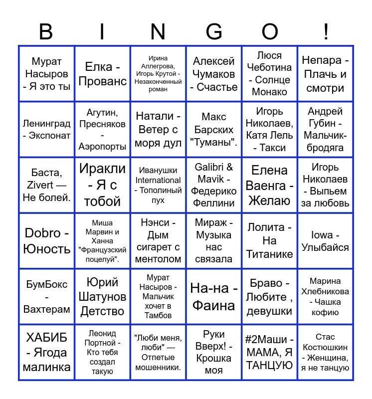 This bingo card has 36 words: Dobro - Юность, Миша Марвин и Ханна "Французский поцелуй"., "Люби меня, люби" — Отпетые мошенники., Макс Барских "Туманы"., Елена Ваенга - Желаю, Игорь Николаев - Выпьем за любовь, Мурат Насыров - Я это ты, Леонид Портной - Кто тебя создал такую, Ирина Аллегрова, Игорь Крутой - Незаконченный роман, На-на - Фаина, Игорь Николаев, Катя Лель - Такси, Непара - Плачь и смотри, БумБокс - Вахтерам, Иракли - Я с тобой, Натали - Ветер с моря дул, Алексей Чумаков - Счастье, Браво - Любите , девушки, Iowa - Улыбайся, Ленинград - Экспонат, Агутин, Пресняков - Аэропорты, Нэнси - Дым сигарет с ментолом, Мираж - Музыка нас связала, Лолита - На Титанике, Марина Хлебникова - Чашка кофию, Баста, Zivert — Не болей., Елка - Прованс, Иванушки International - Тополиный пух, Руки Вверх! - Крошка моя, Люся Чеботина - Солнце Монако, Андрей Губин - Мальчик-бродяга, ХАБИБ - Ягода малинка, Юрий Шатунов Детство, Мурат Насыров - Мальчик хочет в Тамбов, Galibri & Mavik - Федерико Феллини, #2Маши - МАМА, Я ТАНЦУЮ and Стас Костюшкин - Женщина, я не танцую.