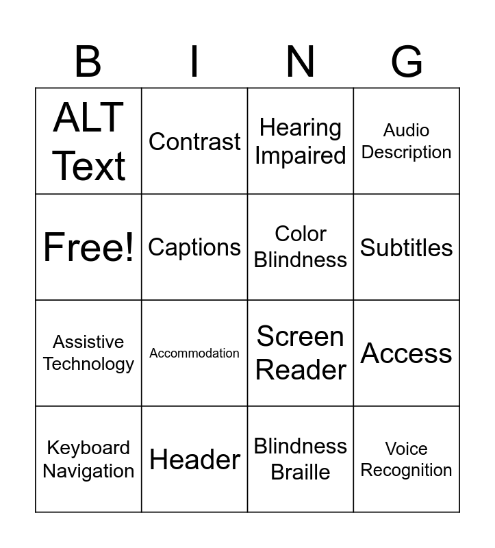 This bingo card has 16 words: Header, Access, Hearing Impaired, ALT Text, Assistive Technology, Contrast, Screen Reader, Blindness Braille, Free!, Captions, Keyboard Navigation, Audio Description, Accommodation, Subtitles, Color Blindness and Voice Recognition.
