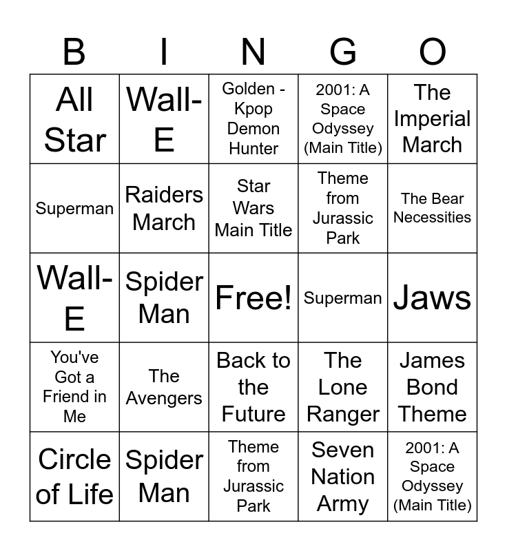 ⚠ This card has duplicate items: Pink Panther Theme (2), 2001: A Space Odyssey (Main Title) (2), Rocky (Main Theme) (2), Hedwig's Theme (2), Circle of Life (2), The Bear Necessities (2), Wall-E (2), Mission: Impossible (2), Star Wars Main Title (2), Raiders March (2), Back to the Future (2), Batman Theme (2), Jaws (2), The Imperial March (2), Ghostbusters (2), Superman (2), Spider Man (2), All Star (2), Space Jam (2), The Avengers (2), Theme from Jurassic Park (2), The Lone Ranger (2), You've Got a Friend in Me (2), Seven Nation Army (2), Don't You, Forget About Me (2), Pirates of the Caribbean (2), Apollo 13 (2), Tangled: Kingdom Dance (2), James Bond Theme (2), Final Countdown (2), Golden - Kpop Demon Hunter (2), E.T. Main Theme (2), Chariots of Fire (2)
