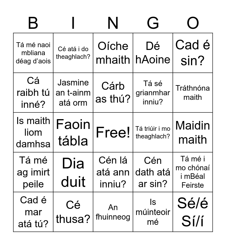 This bingo card has a free space and 24 words: Dia duit, Cé thusa?, Cárb as thú?, Cad é mar atá tú?, Cad é sin?, Tá mé naoi mbliana déag d’aois, Cá raibh tú inné?, Cé atá i do theaghlach?, Tá triúir i mo theaghlach?, Cén lá atá ann inniu?, Tá sé grianmhar inniu?, Is maith liom damhsa, Cén dath atá ar sin?, Tá mé i mo chónaí i mBéal Feirste, Jasmine an t-ainm atá orm, Is múinteoir mé, Maidin maith, Oíche mhaith, Tráthnóna maith, Faoin tábla, Sé/é Sí/í, Tá mé ag imirt peile, Dé hAoine and An fhuinneog.