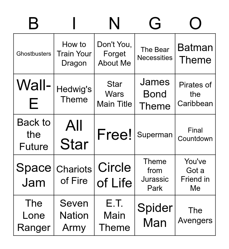 This bingo card has a free space and 35 words: Pink Panther Theme, 2001: A Space Odyssey (Main Title), Rocky (Main Theme), Hedwig's Theme, Circle of Life, The Bear Necessities, Wall-E, Mission: Impossible, Star Wars Main Title, Raiders March, Back to the Future, Batman Theme, Jaws, The Imperial March, Ghostbusters, Superman, Spider Man, All Star, Space Jam, The Avengers, Theme from Jurassic Park, The Lone Ranger, You've Got a Friend in Me, Seven Nation Army, Don't You, Forget About Me, Pirates of the Caribbean, Apollo 13, Tangled: Kingdom Dance, James Bond Theme, Final Countdown, Golden - Kpop Demon Hunter, E.T. Main Theme, Chariots of Fire, How to Train Your Dragon and The Incredibles.