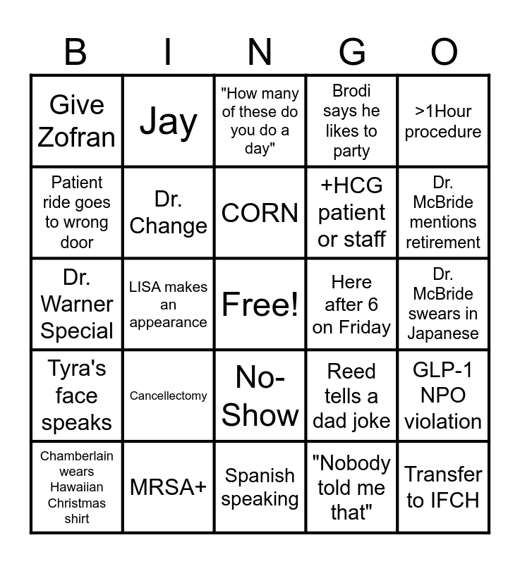 This bingo card has a free space and 39 words: Couple Colonoscopy, 3+IV attempts, JQ gets an attitude, Dr. Change, Chamberlain wears Hawaiian Christmas shirt, No-Show, CORN, State Comes, >1Hour procedure, Tyra's face speaks, LISA makes an appearance, Brodi says he likes to party, Transfer to IFCH, Dr. McBride swears in Japanese, Here after 6 on Friday, Cancellectomy, Someone brings us cookies, Give Zofran, 30+ Minute phone call, Reed tells a dad joke, Patient ride goes to wrong door, Spanish speaking, +HCG patient or staff, Dr. McBride mentions retirement, Anesthesia takes ipad out of department, 10+ Polyps, Jen makes her noise, "Come on Paul", FOS, Jay, Foreign Body, Chelsea Sings, "How many of these do you do a day", MRSA+, "Nobody told me that", Give D10, GLP-1 NPO violation, Dr. Warner Special and Blackfoot Special.