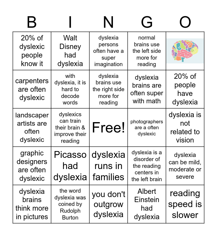 This bingo card has 1 images, a free space and 23 words: Picasso had dyslexia, the word dyslexia was coined by Rudolph Burton, dyslexia brains use the right side more for reading, dyslexia brains think more in pictures, 20% of dyslexic people know it, carpenters are often dyslexic, Walt Disney had dyslexia, photographers are a often dyslexic, dyslexia runs in families, dyslexia brains are often super with math, landscaper artists are often dyslexic, dyslexia is a disorder of the reading centers in the left brain, dyslexia can be mild, moderate or severe, with dyslexia, it is hard to decode words, Albert Einstein had dyslexia, dyslexia is not related to vision, dyslexia persons often have a super imagination, 20% of people have dyslexia, dyslexics can train their brain & improve their reading, reading speed is slower, graphic designers are often dyslexic, normal brains use the left side more for reading and you don't outgrow dyslexia.