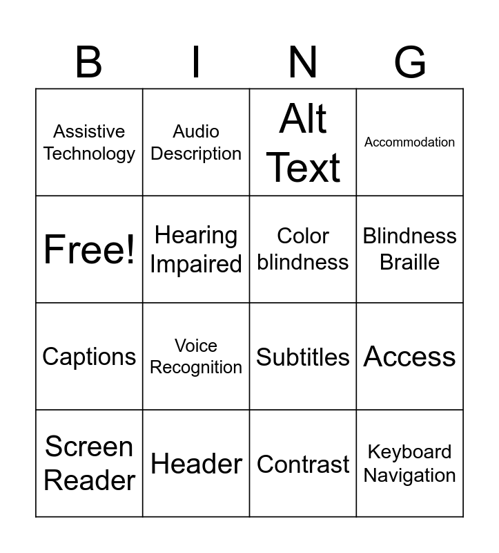 This bingo card has 16 words: Header, Access, Alt Text, Assistive Technology, Captions, Audio Description, Subtitles, Contrast, Free!, Hearing Impaired, Screen Reader, Accommodation, Voice Recognition, Blindness Braille, Color blindness and Keyboard Navigation.