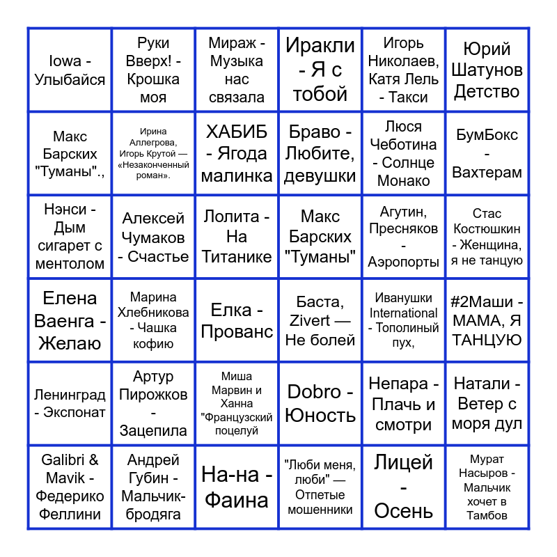 This bingo card has 36 words: Dobro - Юность, Миша Марвин и Ханна "Французский поцелуй, "Люби меня, люби" — Отпетые мошенники, Макс Барских "Туманы".,, Елена Ваенга - Желаю, Макс Барских "Туманы", Ирина Аллегрова, Игорь Крутой — «Незаконченный роман»., На-на - Фаина, Игорь Николаев, Катя Лель - Такси, Непара - Плачь и смотри, БумБокс - Вахтерам, Иракли - Я с тобой, Натали - Ветер с моря дул, Алексей Чумаков - Счастье, Браво - Любите, девушки, Iowa - Улыбайся, Ленинград - Экспонат, Агутин, Пресняков - Аэропорты, Нэнси - Дым сигарет с ментолом, Мираж - Музыка нас связала, Лолита - На Титанике, Марина Хлебникова - Чашка кофию, Баста, Zivert — Не болей, Елка - Прованс, Иванушки International - Тополиный пух,, Руки Вверх! - Крошка моя, Люся Чеботина - Солнце Монако, Андрей Губин - Мальчик-бродяга, ХАБИБ - Ягода малинка, Юрий Шатунов Детство, Мурат Насыров - Мальчик хочет в Тамбов, Galibri & Mavik - Федерико Феллини, #2Маши - МАМА, Я ТАНЦУЮ, Стас Костюшкин - Женщина, я не танцую, Артур Пирожков - Зацепила and Лицей - Осень.