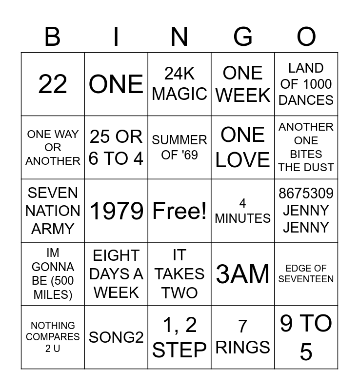 This bingo card has a free space and 31 words: 1, 2 STEP, 10,000 HOURS, 1979, 1999, 22, 24K MAGIC, 25 OR 6 TO 4, 3AM, 4 MINUTES, 7 RINGS, 8675309 JENNY JENNY, 9 TO 5, 99 RED BALLOONS, A THOUSAND MILES, ANOTHER ONE BITES THE DUST, BABY ONE MORE TIME, EDGE OF SEVENTEEN, EIGHT DAYS A WEEK, IM GONNA BE (500 MILES), IT TAKES TWO, LAND OF 1000 DANCES, MAMBO NO. 5, NOTHING COMPARES 2 U, ONE, ONE LOVE, ONE WAY OR ANOTHER, ONE WEEK, SEVEN NATION ARMY, SONG2, SUMMER OF '69 and THREE LITTLE BIRDS.
