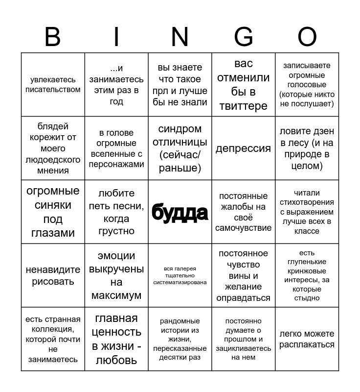 This bingo card has a free space and 24 words: есть странная коллекция, которой почти не занимаетесь, эмоции выкручены на максимум, синдром отличницы (сейчас/раньше), постоянно думаете о прошлом и зацикливаетесь на нем, записываете огромные голосовые (которые никто не послушает), увлекаетесь писательством, ...и занимаетесь этим раз в год, вы знаете что такое прл и лучше бы не знали, постоянные жалобы на своё самочувствие, читали стихотворения с выражением лучше всех в классе, огромные синяки под глазами, в голове огромные вселенные с персонажами, постоянное чувство вины и желание оправдаться, есть глупенькие кринжовые интересы, за которые стыдно, блядей корежит от моего людоедского мнения, главная ценность в жизни - любовь, рандомные истории из жизни, пересказанные десятки раз, вас отменили бы в твиттере, ловите дзен в лесу (и на природе в целом), ненавидите рисовать, любите петь песни, когда грустно, вся галерея тщательно систематизирована, депрессия and легко можете расплакаться.