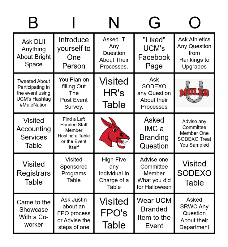 This bingo card has 1 images, a free space and 23 words: Visited Sponsored Programs Table, Ask Justin about an FPO process or Advise the steps of one, Visited HR's Table, Came to the Showcase With a Co-worker, Ask Athletics Any Question from Rankings to Upgrades, Ask DLII Anything About Bright Space, Tweeted About Participating in the event using UCM's Hashtag #MuleNation, Introduce yourself to One Person, Asked IMC a Branding Question, High-Five any Individual In Charge of a Table, Ask SODEXO any Question About their Processes, Visited Accounting Services Table, Advise one Committee Member What you did for Halloween, Visited SODEXO Table, You Plan on filling Out The Post Event Survey., Wear UCM Branded Item to the Event, Advise any Committee Member One SODEXO Treat You Sampled, Asked IT Any Question About Their Processes., Find a Left Handed Staff Member Hosting a Table or the Event itself, Asked SRWC Any Question About their Department, Visited Registrars Table, "Liked" UCM's Facebook Page and Visited FPO's Table.