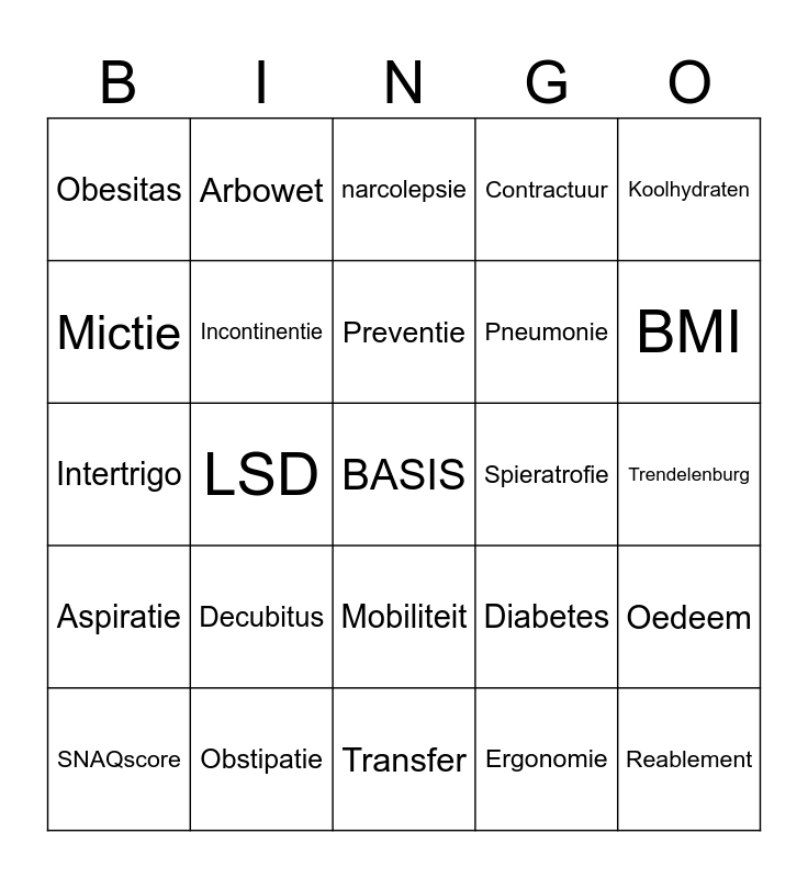This bingo card has a free space and 49 words: Anorexia, Reablement, Hygiene, Transfer, Decubitus, Infectie, Arbowet, Stomatitis, Mictie, Defecatie, Incontinentie, Contractuur, Oedeem, Diabetes, PG, Hydratatie, Preventie, Spieratrofie, Dehydratie, Koolhydraten, LSD, Ergonomie, Obesitas, Pneumonie, ADL, BMI, SNAQscore, blaasretentie, Mobiliteit, Aspiratie, Urinaal, Uritip, Bladderscan, klysma, Obstipatie, Rectaal, Vochtbalans, Sputum, Trendelenburg, Werkproces, Delier, Empathie, Osteoporose, trombose, Intertrigo, narcolepsie, slaapapneu, Gebitsprothese and supplement.