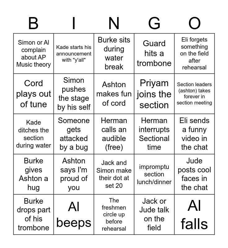 This bingo card has a free space and 24 words: Ashton says I'm proud of you, Al beeps, Ashton makes fun of cord, Burke drops part of his trombone, Eli forgets something on the field after rehearsal, Simon or Al complain about AP Music theory, Cord plays out of tune, Kade starts his announcement with "y'all", Herman interrupts Sectional time, Jack and Simon make their dot at set 20, Priyam joins the section, Kade ditches the section during water, impromptu section lunch/dinner, Jude posts cool faces in the chat, Simon pushes the stage by his self, Jack or Jude talk on the field, Eli sends a funny video in the chat, Burke sits during water break, Section leaders (ashton) takes forever in section meeting, Someone gets attacked by a bug, Al falls, Burke gives Ashton a hug, Guard hits a trombone and The freshmen circle up before rehearsal.