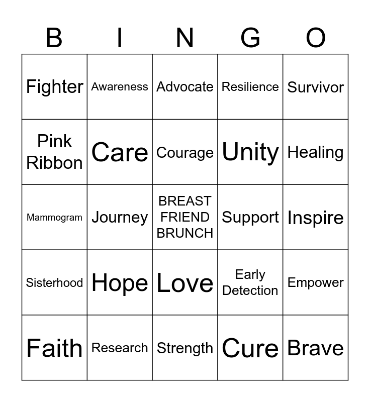 This bingo card has a free space and 25 words: Hope, Strength, Courage, Faith, Survivor, Fighter, Pink Ribbon, Awareness, Support, Love, Unity, Mammogram, Early Detection, Empower, Care, Community, Inspire, Advocate, Healing, Journey, Brave, Research, Sisterhood, Resilience and Cure.
