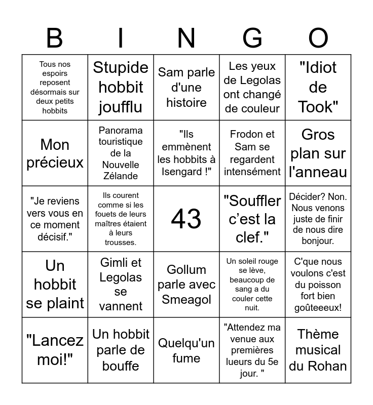 This bingo card has a free space and 24 words: Gimli et Legolas se vannent, Un hobbit parle de bouffe, "Ils emmènent les hobbits à Isengard !", "Lancez moi!", "Idiot de Took", Tous nos espoirs reposent désormais sur deux petits hobbits, Mon précieux, Stupide hobbit joufflu, "Souffler c’est la clef.", Gollum parle avec Smeagol, Frodon et Sam se regardent intensément, "Je reviens vers vous en ce moment décisif.", Un soleil rouge se lève, beaucoup de sang a du couler cette nuit., C'que nous voulons c'est du poisson fort bien goûteeeux!, Panorama touristique de la Nouvelle Zélande, "Attendez ma venue aux premières lueurs du 5e jour. ", Décider? Non. Nous venons juste de finir de nous dire bonjour., Sam parle d'une histoire, Gros plan sur l'anneau, Ils courent comme si les fouets de leurs maîtres étaient à leurs trousses., Thème musical du Rohan, Un hobbit se plaint, Les yeux de Legolas ont changé de couleur and Quelqu'un fume.