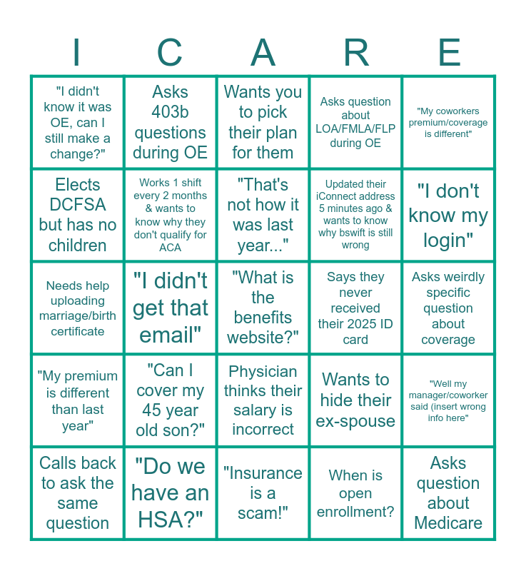 This bingo card has 25 words: "Can I cover my 45 year old son?", "Insurance is a scam!", "That's not how it was last year...", Calls back to ask the same question, "My coworkers premium/coverage is different", "I didn't know it was OE, can I still make a change?", Elects DCFSA but has no children, Asks 403b questions during OE, Says they never received their 2025 ID card, Physician thinks their salary is incorrect, Updated their iConnect address 5 minutes ago & wants to know why bswift is still wrong, Needs help uploading marriage/birth certificate, Wants to hide their ex-spouse, "Well my manager/coworker said (insert wrong info here", Works 1 shift every 2 months & wants to know why they don't qualify for ACA, Asks question about Medicare, Asks weirdly specific question about coverage, Wants you to pick their plan for them, "I don't know my login", "I didn't get that email", "What is the benefits website?", "Do we have an HSA?", "My premium is different than last year", Asks question about LOA/FMLA/FLP during OE and When is open enrollment?.
