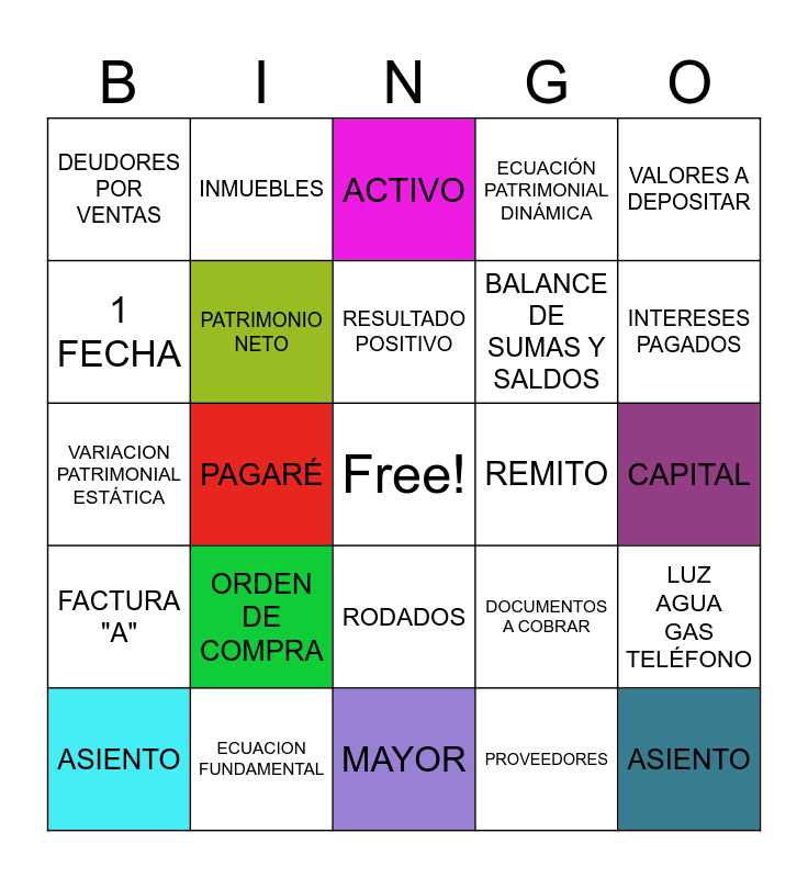This bingo card has a free space and 29 words: ASIENTO, CHEQUE PAGO DIFERIDO, PAGARÉ, PARTIDA DOBLE, DEUDORES POR VENTAS, ACTIVO, PATRIMONIO NETO, ORDEN DE COMPRA, REMITO, ECUACION FUNDAMENTAL, CAPITAL, ASIENTO, MAYOR, PROVEEDORES, INTERESES PAGADOS, INSTALACIONES, RODADOS, FACTURA "A", VALORES A DEPOSITAR, VARIACION PATRIMONIAL ESTÁTICA, DOCUMENTOS A COBRAR, EMPRESA, BALANCE DE SUMAS Y SALDOS, 1 FECHA, ECUACIÓN PATRIMONIAL DINÁMICA, INMUEBLES, LUZ AGUA GAS TELÉFONO, RESULTADO POSITIVO and DOCUMENTOS INTERNOS.