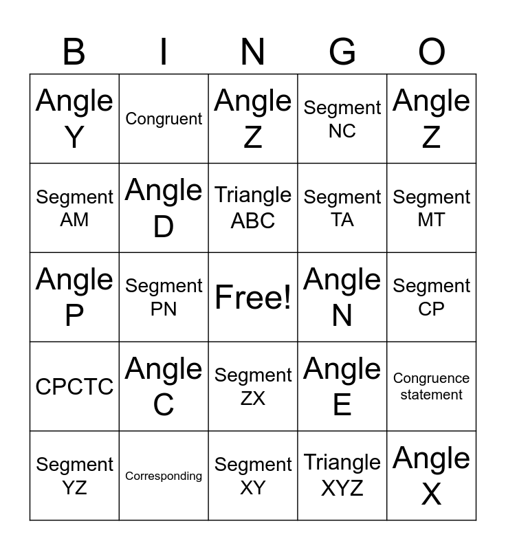 This bingo card has a free space and 24 words: Angle C, Corresponding, Triangle ABC, Segment YZ, Angle Z, Angle Y, Segment AM, Congruent, Angle N, Segment ZX, Segment TA, Angle P, Angle E, Congruence statement, Angle D, Triangle XYZ, Segment CP, Angle Z, Segment MT, Segment PN, Angle X, CPCTC, Segment NC and Segment XY.
