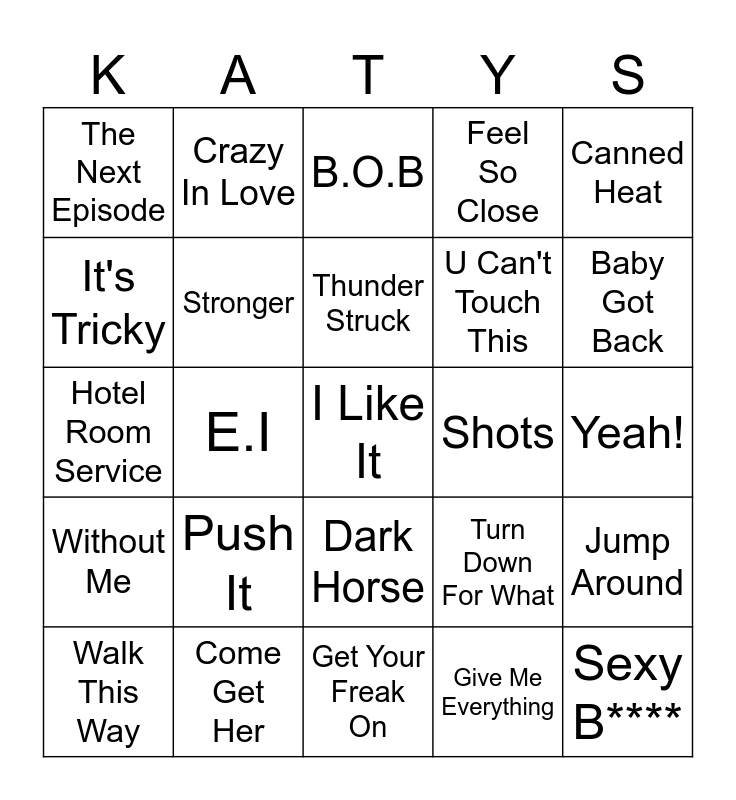 This bingo card has 31 words: Get Your Freak On, Party Up, E.I, 99 Problems, The Next Episode, B.O.B, Stronger, Turn Down For What, Shots, Give Me Everything, Yeah!, I Like It, Sexy B****, Sicko Mode, Baby Got Back, This Is How We Do It, Jump Around, Push It, Without Me, Dark Horse, Canned Heat, One More Time, Walk This Way, Crazy In Love, U Can't Touch This, It's Tricky, Feel So Close, Hotel Room Service, Come Get Her, Thunder Struck and Every Time We Touch.