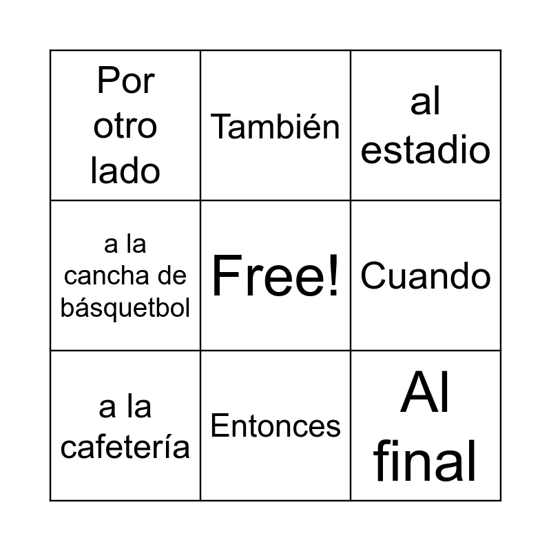 This bingo card has a free space and 23 words: Primero, Después, Entonces, Ahora, Al final, Por otro lado, Cuando, También, voy, vas, va, vamos, vais, van, al gimnasio, al auditorio, al estadio, al estacionamiento, a la cafetería, a la biblioteca, a la cancha de básquetbol, Mi clase favorita es and Mi clase menos favorita es.