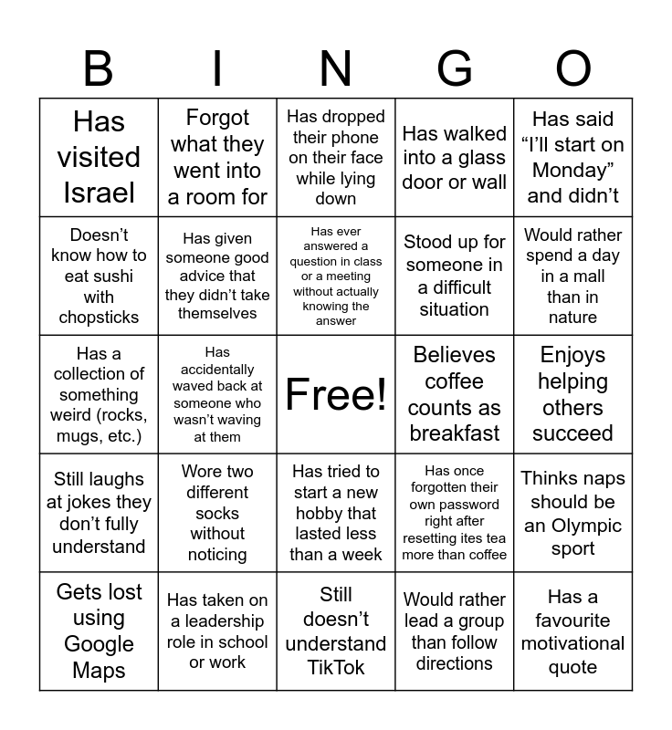 This bingo card has a free space and 29 words: Gets lost using Google Maps, Has a hard time remembering names — but never forgets faces, Has accidentally waved back at someone who wasn’t waving at them, Once pretended to understand a topic they didn’t, Has visited Israel, Has dropped their phone on their face while lying down, Has given someone good advice that they didn’t take themselves, Wore two different socks without noticing, Believes coffee counts as breakfast, Has taken on a leadership role in school or work, Enjoys helping others succeed, Has a favourite motivational quote, Still doesn’t understand TikTok, Would rather lead a group than follow directions, Would rather spend a day in a mall than in nature, Always takes “just one more bite”, Has tried to start a new hobby that lasted less than a week, Still laughs at jokes they don’t fully understand, Has said “I’ll start on Monday” and didn’t, Has a collection of something weird (rocks, mugs, etc.), Has once forgotten their own password right after resetting ites tea more than coffee, Has accidentally worn their shirt inside out, Stood up for someone in a difficult situation, Doesn’t know how to eat sushi with chopsticks, Has walked into a glass door or wall, Forgot what they went into a room for, Thinks naps should be an Olympic sport, Has ever answered a question in class or a meeting without actually knowing the answer and Has sung loudly in the car.