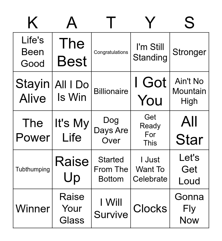 This bingo card has 39 words: We are The Champions, Don't Stop Believing, Eye Of The Tiger, All I Do Is Win, Winner, Started From The Bottom, Billionaire, Survivor, Stronger, Tubthumping, It's My Life, I'm Still Standing, Dog Days Are Over, All Star, Get Ready For This, Raise Up, Good Feeling, Life's Been Good, You Can Make It If you Try, I Just Want To Celebrate, Stayin Alive, I Will Survive, I Got You, Ain't No Mountain High, Iron Man, Heroes, Gonna Fly Now, Lose Yourself, Remember The Name, The Best, I believe We Will Win, Ain't No Stopping Us Now, Congratulations, Raise Your Glass, Clocks, Victorious, Let's Get Loud, The Power and #1.