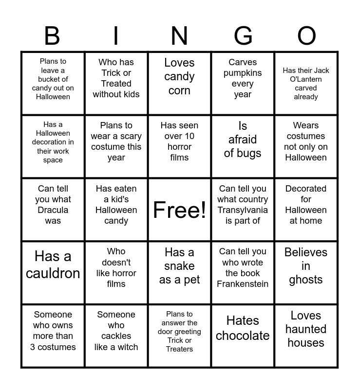 This bingo card has a free space and 24 words: Who doesn't like horror films, Someone who cackles like a witch, Has seen over 10 horror films, Someone who owns more than 3 costumes, Has their Jack O'Lantern carved already, Plans to leave a bucket of candy out on Halloween, Has a Halloween decoration in their work space, Who has Trick or Treated without kids, Can tell you what country Transylvania is part of, Has a snake as a pet, Is afraid of bugs, Can tell you what Dracula was, Can tell you who wrote the book Frankenstein, Believes in ghosts, Plans to wear a scary costume this year, Hates chocolate, Decorated for Halloween at home, Loves candy corn, Wears costumes not only on Halloween, Has eaten a kid's Halloween candy, Loves haunted houses, Has a cauldron, Carves pumpkins every year and Plans to answer the door greeting Trick or Treaters.