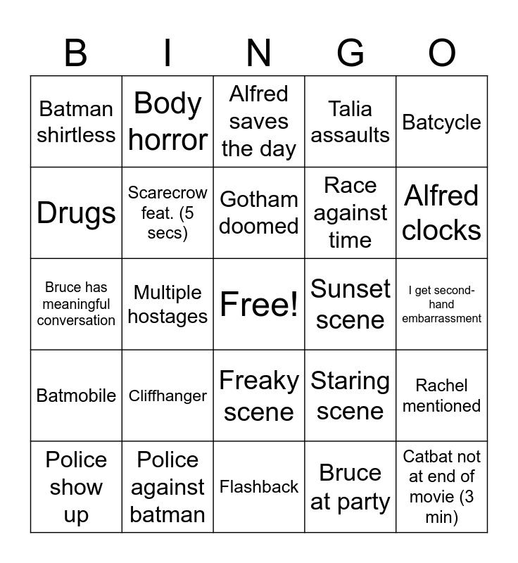 This bingo card has a free space and 29 words: Police show up, Gun violence, Multiple hostages, Batman gets brutally beat, Batman shirtless, Alfred saves the day, Scarecrow feat. (5 secs), Cliffhanger, Sunset scene, Police against batman, I get second-hand embarrassment, Catbat not at end of movie (3 min), Flashback, Bruce at party, Alfred clocks, Other hero mentioned, Freaky scene, Batmobile, Batcycle, Bruce has meaningful conversation, Staring scene, The bat signal, Race against time, Drugs, Talia assaults, Body horror, Rachel mentioned, Gotham doomed and Bane beats up scarecrow.