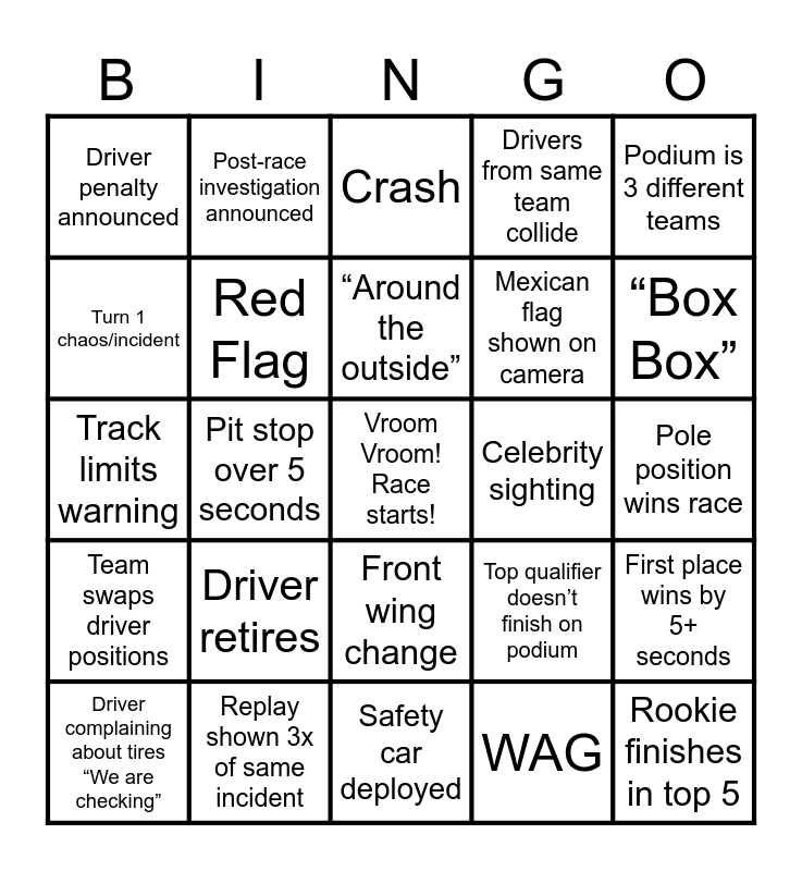 This bingo card has a free space and 31 words: Safety car deployed, Virtual safety car, Pit stop over 5 seconds, Pit stop under 2.2 seconds, Driver penalty announced, Crash, Red Flag, Top qualifier doesn’t finish on podium, Celebrity sighting, WAG, Pole position wins race, Rookie finishes in top 5, Plan A/B/C mentioned, Driver gets lapped, “Box Box”, Swearing on radio, First place wins by 5+ seconds, Driver retires, Team swaps driver positions, Front wing change, Podium is 3 different teams, Double DNF (team), Driver complaining about tires “We are checking”, Post-race investigation announced, Mexican flag shown on camera, Turn 1 chaos/incident, Drivers from same team collide, Track limits warning, Replay shown 3x of same incident, “Around the outside” and Mention of the high altitude.