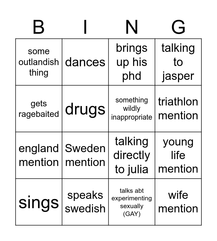 This bingo card has 18 words: Sweden mention, wife mention, brings up his phd, some outlandish thing, talking directly to julia, talking to jasper, sings, dances, triathlon mention, england mention, talks abt experimenting sexually (GAY), gets ragebaited, young life mention, drugs, something wildly inappropriate, talks to mariana, speaks swedish and his dog.